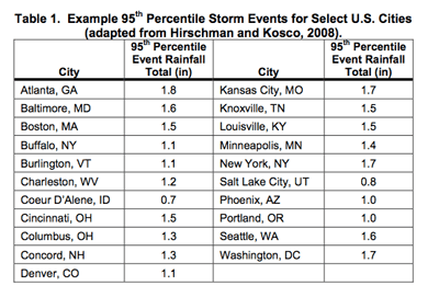 The guidelines establish two options for meeting Section 438. The first option is to retain 100% of a rainfall event on site that is less than or equal to a 95th percentile. A 95th percentile rainfall event is an event with a volume over a 24-hr period that is equal to or less than the volume of 95% of all rain events for a period of record (i.e. 20 to 30 years). The table from the report provided below shows the size of the 95th percentile events for various cities across the Country. The events range between 0.7 to 1.8 inches of rainfall. These events commonly known as a “first flush” event were identified because they often contain the highest level of pollutants. Option 2 allows designers to conduct their own hydrological analysis and determine the site specific pre-development hydrological conditions. This options states that “temperature of runoff should not exceed the pre-development rates and the predevelopment hydrology should be replicated.”
