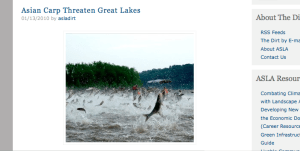 In ASLA’s blog ‘The Dirt’, a recent posts highlights the efforts for the State of Michigan to protect Lake Michigan and the entire Great Lakes Region from the Asian Carp. Like all invasive species these fish take over an ecosystem by consuming resources that would otherwise be used by the native species. Michigan is suing the State of Illinois in order that they shut down the waterways leading into Lake Michigan. According to the New York Times article Minnesota, Ohio, Wisconsin, and Indiana are all in support. This came to light due to recent evidence of the carp within 6 miles of Lake Michigan in the Chicago area waterway system that links the Mississippi River to the Great Lakes. And while the City of Chicago realizes that the carp overtaking Lake Michigan would be devastating they are wrestling with their own economic concerns over what closing the waterways would really mean. There is more detailed information in ‘The Dirt’ post and the New York Times Article.